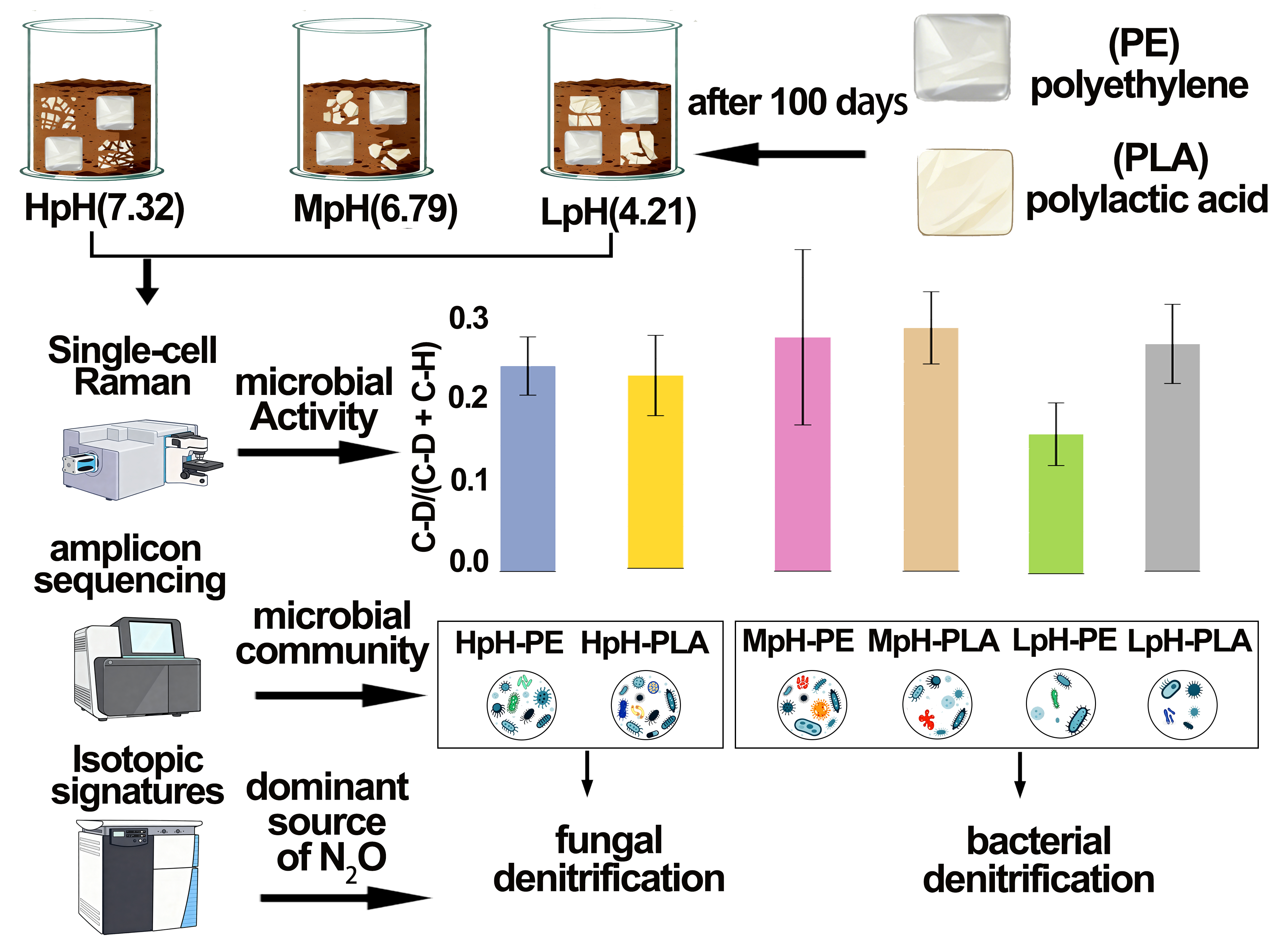 Soil acidification degrades agroecosystem quality, while plastic residues create distinct plastisphere niches in agricultural soils. However, how plastisphere microbiota regulate nitrogen transformations under soil acidification remains unclear. Here, microcosm experiments integrating acetylene inhibition, N2O isotopocule analysis, single-cell Raman–D2O probing, and bacterial 16S rRNA and eukaryotic 18S rRNA gene sequencing were used to investigate plastisphere-mediated denitrification along a soil pH gradient (4.17–7.82) in polyethylene (PE)- and polylactic acid (PLA)-amended soils. Soil acidification significantly altered soil physicochemical properties and inorganic nitrogen pools. Both PE and PLA plastispheres enhanced denitrification and N2O emission rates relative to bulk soil, with PLA showing stronger responses under acidic conditions. Along the acidification gradient, the dominant N2O production pathway shifted from fungal denitrification at high pH to bacterial denitrification at medium and low pH. Although acidification generally reduced microbial diversity and reshaped community composition, the PLA plastisphere maintained higher single-cell metabolic activity than PE and bulk soil under low-pH stress. Denitrification in the PLA plastisphere was also associated with a broader set of environmental and biotic factors, including bacterial, eukaryotic, and viral community attributes. These findings demonstrate that soil pH and plastic type jointly regulate plastisphere microbial community assembly, metabolic activity, and N2O production pathways in acidifying soils.