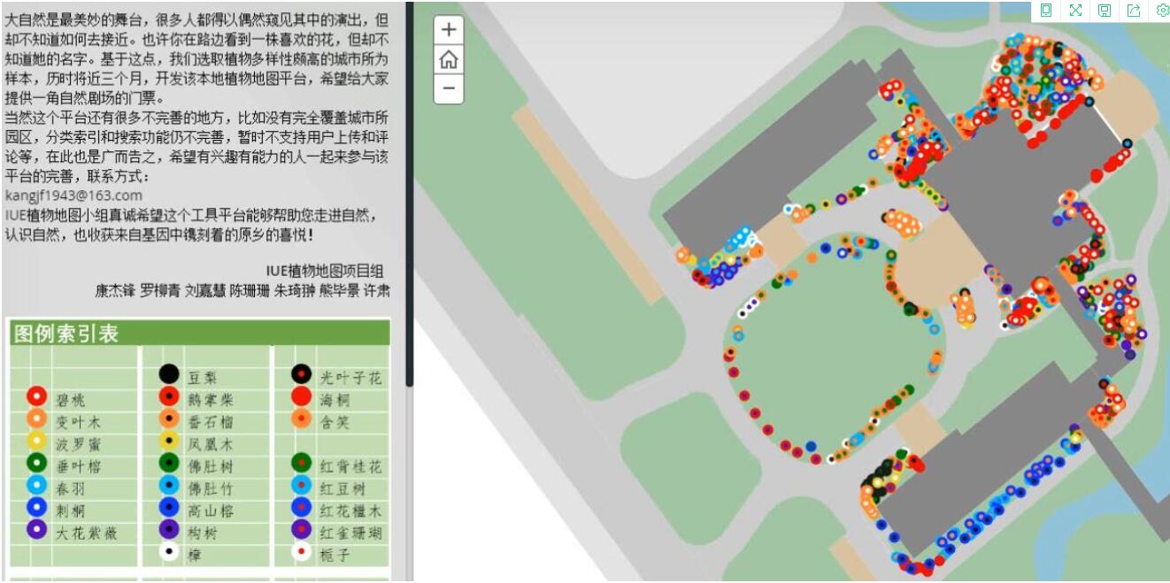 IUE植物导览地图是一个在线电子地图,可以在电脑和手机上使用。界面主要呈现几个要素:研究所底图,植物分布点及其照片,植物图例系统。