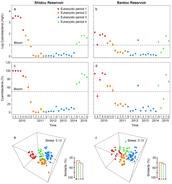 Although it is widely recognized that cyanobacterial blooms have substantial influence on the plankton community in general, their correlations with the whole community of eukaryotic plankton at longer time scales remain largely unknown. Here, we investigated the temporal dynamics of eukaryotic plankton communities in two subtropical reservoirs over a 6-year period (2010-2015) following one cyanobacterial biomass cycle-the cyanobacterial bloom (middle 2010), cyanobacteria decrease (late 2010-early 2011), non-bloom (2011-2014), cyanobacteria increase, and second bloom (late 2014-2015). The eukaryotic community succession that strongly correlated with this cyanobacterial biomass cycle was divided into four periods, and each period had distinct characteristics in cyanobacterial biomass and environments in both reservoirs. Integrated co-occurrence networks of eukaryotic plankton based on the whole study period revealed that the cyanobacterial biomass had remarkably high network centralities, and the eukaryotic OTUs that had stronger correlations with the cyanobacterial biomass exhibited higher centralities. The integrated networks were also modularly responded to different eukaryotic succession periods, and therefore correlated with the cyanobacterial biomass cycle. Moreover, sub-networks based on the different eukaryotic succession periods indicated that the eukaryotic co-occurrence patterns were not constant but varied largely associating with the cyanobacterial biomass. Based on these long-term observations, our results reveal that the cyanobacterial biomass cycle created distinct niches between persistent bloom, non-bloom, decrease and increase of cyanobacteria, and therefore associated with distinct eukaryotic plankton patterns. Our results have important implications for understanding how complex aquatic plankton communities respond to cyanobacterial blooms under the changing environments.