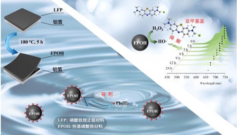 图6 废旧磷酸铁锂电池制备羟基磷酸铁用于吸附重金属铅和芬顿催化降解亚甲基蓝(来源:Environmental Technology & Innovation 2019, 16, 100504)