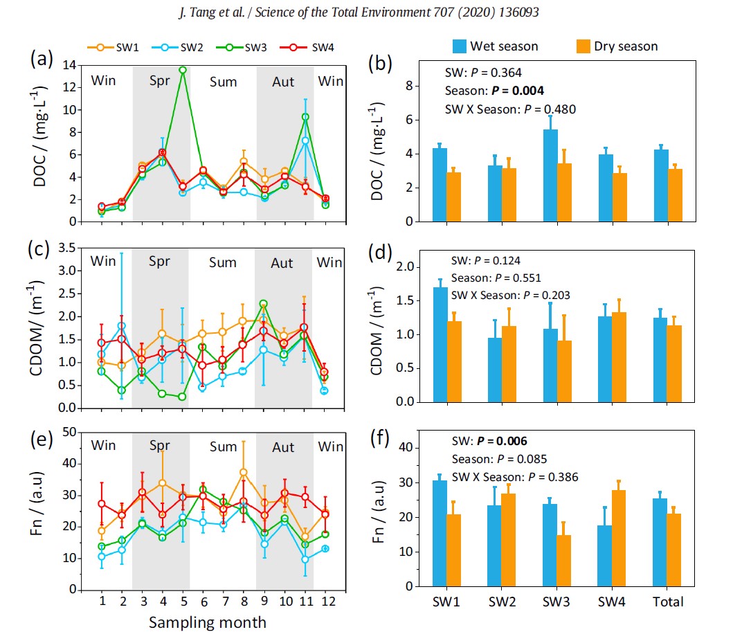 图5 流域DOC、CDOM、FDOM浓度的季节变化(Tang et al., 2020)