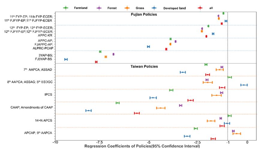 结果表明,研究构建的PM2.5浓度预测模型的十倍交叉验证R2值为0.89,表明其可以用于政策有效性评估。在这14年期间,闽台两岸全境PM2.5浓度水平均明显下降(图1)。政策评估回归模型显示,闽台两岸所有的大气污染防治政策均不同程度减轻了PM2.5污染(图2)。《清净空气行动计划》(CAAP)是台湾地区最有效的控制PM2.5的大气污染防治政策,而国务院印发实施《大气污染防治行动计划》(APPC-AP)、《打赢蓝天保卫战三年行动计划》(3YAP-BS)及当地相应采取的治理政策是福建省最有效的控制PM2.5的大气污染防治政策(图2和图3)。然而,台湾地区的大气污染防治政策有效性取决于其土地利用类型(图2)。