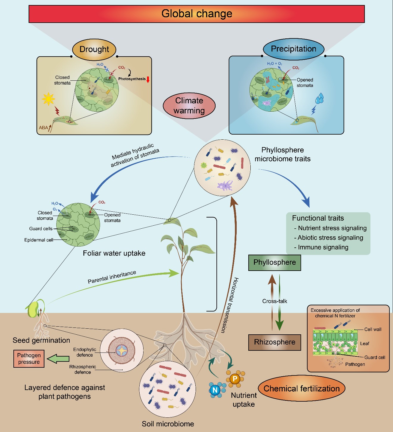 地球上没有真正的植物,几乎所有的植物都是和微生物形成一个生命共同体。健康的植物拥有种类多样而且具有一定分类学结构的微生物群落–植物微生物组,它们在植物组织中和表面无处不在,这些微生物群落在植物的生长发育、养分吸收、抗性应答反应中发挥着重要的作用。因此,植物微生物组也被称为植物的第二基因组。相对于根际微生物,叶际微生物代表的是整个植物的地上部分包括附生和内生的微生物。据统计,当同时考虑到叶子的上下表面时,地球上叶际的总面积接近地球表面积的2倍,栖息多达1026个细菌细胞。如今地球生态系统正经历着快速的全球变化,如气候变化(变暖和干旱)和土地利用变化(栖息地的丧失和化学肥料),这些变化正在对生态系统的过程和功能以及植物、微生物和环境之间的各种相互作用产生了普遍影响。系统地理解全球变化如何影响叶际微生物组,将为利用植物微生物促进生态系统恢复力和作物产量提供重要的基础。