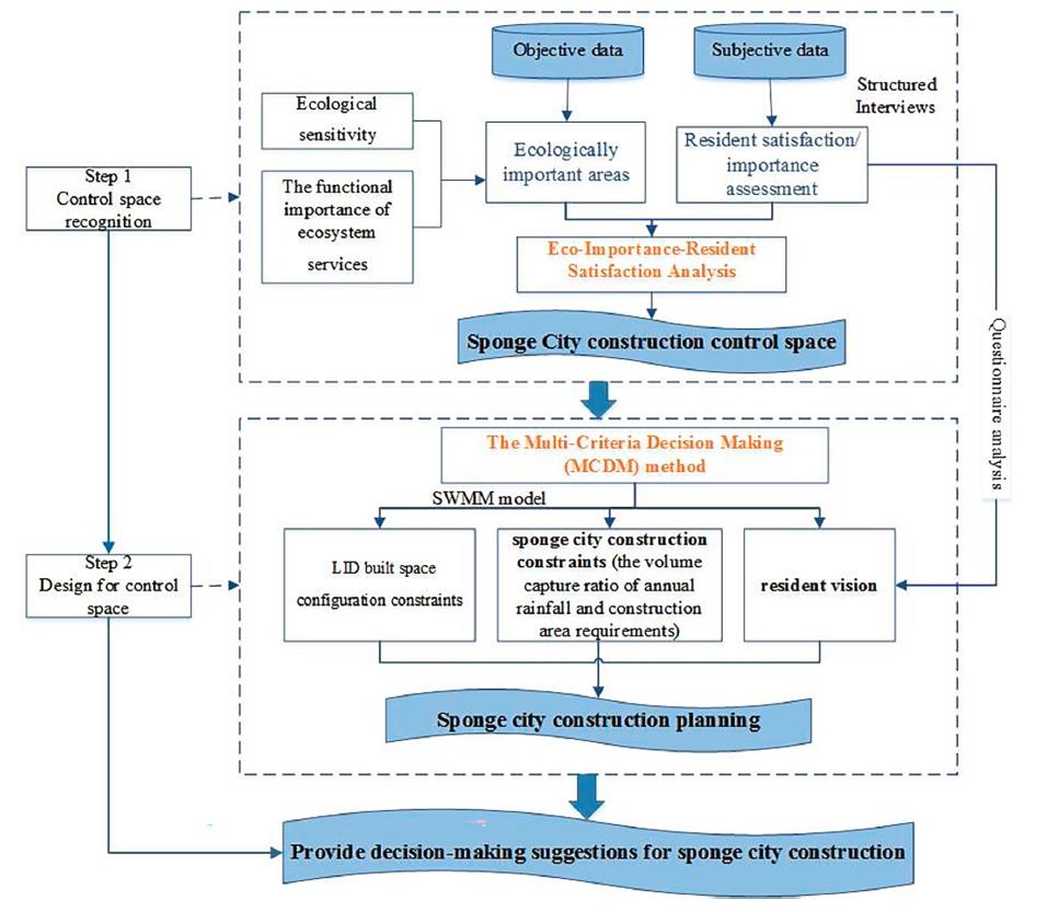 中国科学院城市环境研究所城市生态与可持续发展研究组(石龙宇团队)以惠州市城郊为例开展了相关研究工作,提出了一套可综合评估海绵城市建设生态重要性和居民满意度,同时可指导海绵城市规划建设的综合框架。该框架包含两个部分:“生态重要性-居民满意度分析”(Eco-Importance-Resident Satisfaction Analysis,EIRSA)方法和“多准则决策”(Multi-Criteria Decision Making,MCDM)方法。EIRSA方法可对适合海绵城市建设的控制空间进行识别,并探索城郊居民基本需求和现有生态系统服务能力之间的关系。MCDM方法可优化所识别控制空间的设计。该方法使用GIS和暴雨洪水管理模型(SWMM)结合居民主观视角和海绵城市建设目标从而确定建设区域并选择低影响开发的类型。