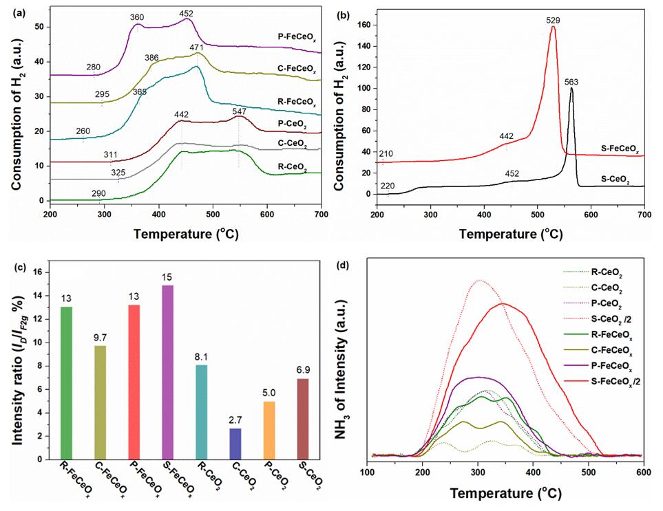 图1. 制备的催化剂的(a)(b) H2-TPR谱图,(c) 拉曼谱峰ID/IF2g比值,(d) NH3-TPD-MS谱图