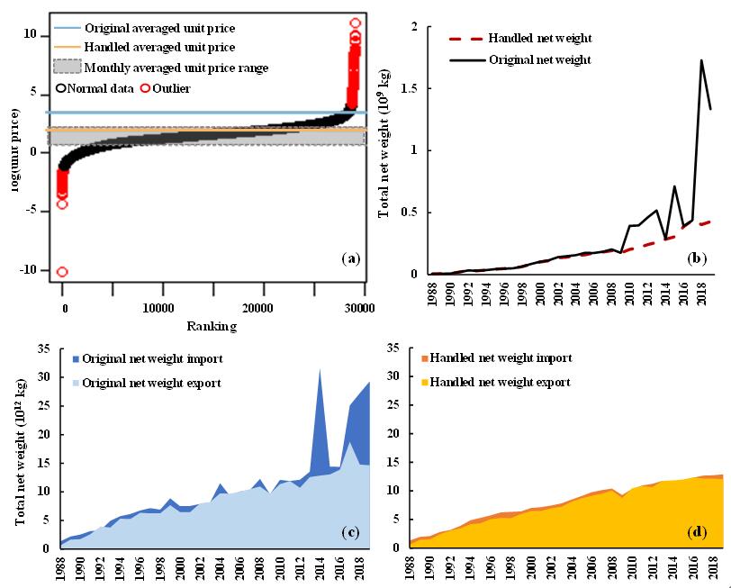 中科院城环所陈伟强研究组联合东北大学王鹤鸣团队针对UN Comtrade数据库1988-2019年5000余种商品的约2亿条国际贸易数据开展了调研梳理、异常值识别、缺失值填补等一系列工作,使UN Comtrade更符合物质流分析使用并为商品贸易类研究提供基础数据支持(图1)。系列工作阐述了商品贸易研究的重要性和所面临的数据挑战,梳理并评估了数据统计口径、预处理过程、数据质量问题以及现有问题解决方案,开发了基于核密度估计的异常值检测与缺失数据估算方法,研究发现各国海关部门在贸易系统划分、商品分类系统选取、合作伙伴定义等统计口径有所差异,造成了数据异常、缺失和不一致三类数据问题,具体表现为几乎所有的商品和国家/地区填报的数据中都存在异常值、所有年份、国家和商品均存在信息缺失的问题并且交易双方填报的商品金额和重量有2倍和3倍的差距。