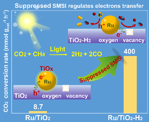 3月,中国科学院城市环境研究所贾宏鹏研究组在期刊Angew.Chem.Int.Ed.发表了题为Suppressive Strong Metal-Support Interactions on Ruthenium/TiO2 Promote Light-Driven Photothermal CO2 Reduction with Methane的文章,该研究通过光驱动光热催化甲烷干重整反应(CO2 + CH4 → 2H2 + 2CO)为探针反应,以Ru/TiO2为模型催化剂,探究了Ru/TiO2上存在的SMSI效应对反应的抑制作用。通过氢气预处理TiO2载体的方式制备Ru/TiO2-H2,可以抑制SMSI效应,进而使干重整反应中CO2的转化速率提升了~46倍。研究发现,在光照条件下,Ru/TiO2上存在的SMSI效应促进TiO2导带中的光生电子注入Ru 纳米颗粒,提高了光生载流子的传输效率,然而这将导致Ru表面电子密度升高,不利于CH4反应物的活化和CO产物的解吸;对于Ru/TiO2-H2,抑制的SMSI效应使得Ru纳米颗粒的热电子迁移到TiO2的氧空位上,进而使Ru表面处于缺电子状态,而缺电子Ruδ+有利于促进干重整反应中的决速步骤——CH4的裂解,同时,氧空位富集的光生电子能促进CO2的活化和解离。最终,Ru/TiO2-H2在光驱动光热干重整反应中明显降低了反应物CO2和CH4的活化能,提升了催化活性,克服了热催化体系的限制。这项工作为通过调节两相相互作用设计高效的光热催化剂提供了重要指导。