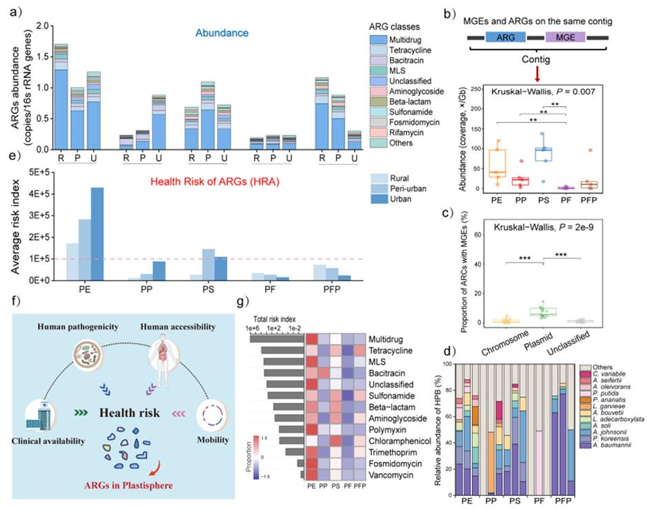 鉴于此,中国科学院城市环境研究所朱永官院士团队-崔丽研究组,在流域尺度上,通过综合考虑ARGs的丰度、人类可及性、移动性、人类致病性和临床可用性,定量评估了5种不同类型微塑料的ARGs健康风险,并深入解析了流域环境中驱动塑料际ARGs健康风险的多重生物及非生物因子,包括微生物群落组装、多样性、代谢功能、城市化水平、塑料类型、抗生素含量及水体理化参数。结果表明,聚乙烯(PE)相比于聚丙烯(PP)、聚苯乙烯(PS)、聚乙烯-纤维(PF)、聚乙烯-纤维-聚乙烯(PFP)其他4种微塑料或塑料与纤维聚合物,具有更高的健康风险,且其风险值随着城市化的增加而进一步增强。因此,应该严格监控河流中聚乙烯的大流行,尤其是在城市区域。污水排放量,作为城市化的重要指标之一,与塑料际ARGs健康风险呈显著正相关。群落组装结果表明,扩散限制作为主要的生物驱动因子影响着细菌群落多样性及其互作,进一步影响ARGs的健康风险。微生物代谢功能分析表明,由于较高的适应度代价,较高的ARGs健康风险往往伴随着塑料际微生物群落正常代谢功能的降低。