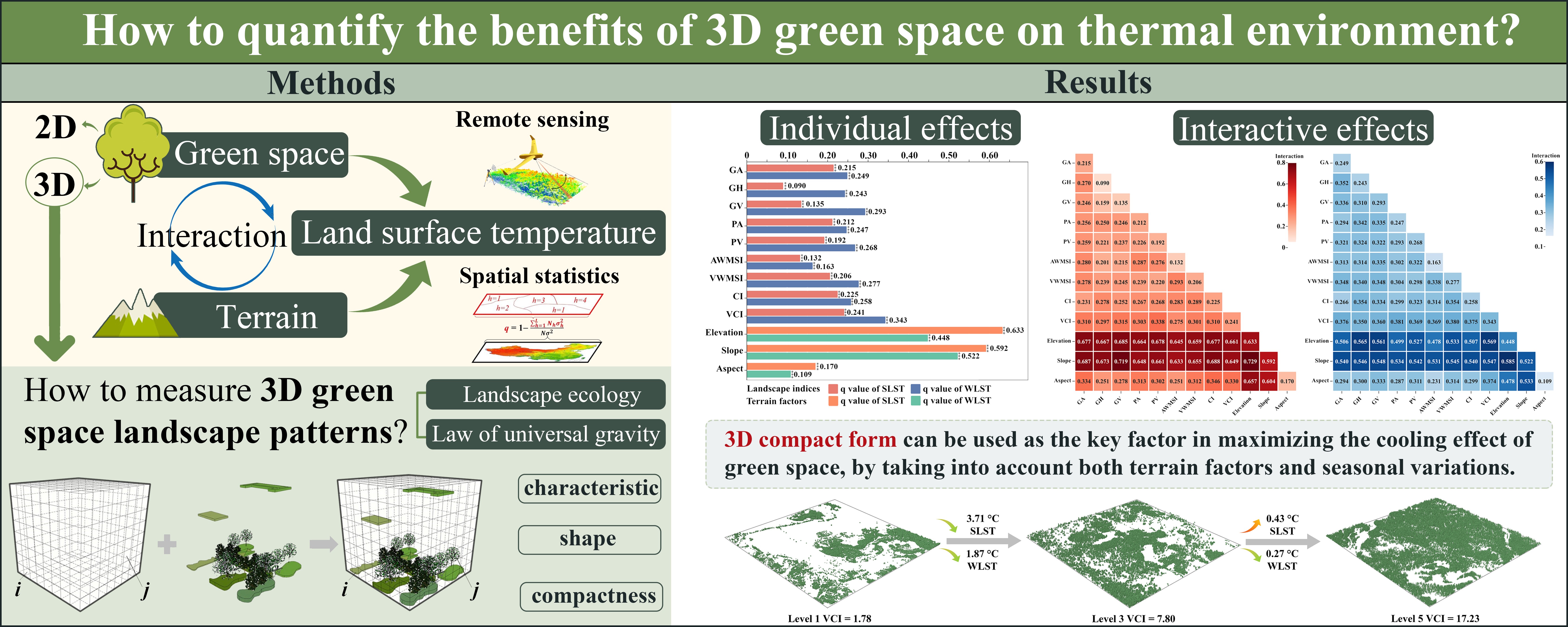 气候变化和城市化的双重影响正在加剧极端天气事件和城市热岛效应。绿地已被广泛认可为一种缓解热环境的有效手段,然而过去的研究主要侧重于绿地的二维形态,而忽略了其三维空间配置。为此,叶红研究组基于景观生态学和万有引力定律发展了一套三维景观指数,通过采集中国四明山的高分辨率激光雷达点云数据,探究绿地的二维和三维景观格局对地表温度的影响机制。