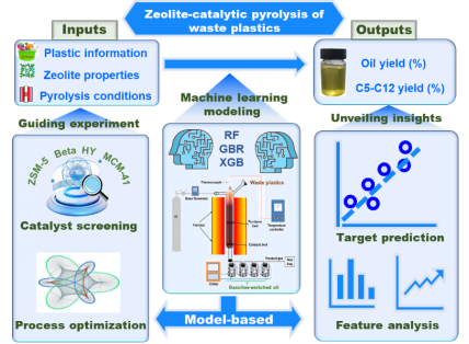 中国科学院城市环境研究所汪印研究团队借助机器学习算法,系统探索了分子筛催化废塑料热解过程中各因素对目标产品的重要性及相关性,并建立了基于机器学习的解释和逆向设计方案,可有效筛选分子筛并优化过程工艺条件,以提高油的产量和品质。结果表明,在三种基于决策树的算法中,极限梯度提升模型在预测液态油和汽油(C5-C12)烃类产率方面表现出最佳性能(测试R² 分别为 0.85 和 0.87)。基于机器学习的因素分析发现,塑料原料中的聚乙烯比例、反应温度、分子筛的比表面积以及硅铝比是最重要的四个特征,并且详细讨论了其对液态油和C5-C12烃类产率的影响。基于逆向设计指导的实验结果表明,通过筛选分子筛并同步优化转化工艺后,液态油品的产率高达 87.82%,该产率甚至比模型优化计算的更高(计算误差-7.93%)。这项工作提供了一种基于机器学习的预测、分析及反向设计新方法,有助于深入理解分子筛催化废塑料的裂解过程并指导实验的开展,加速废塑料向高品质的液态燃油的高效转化,以实现可持续能源生产。