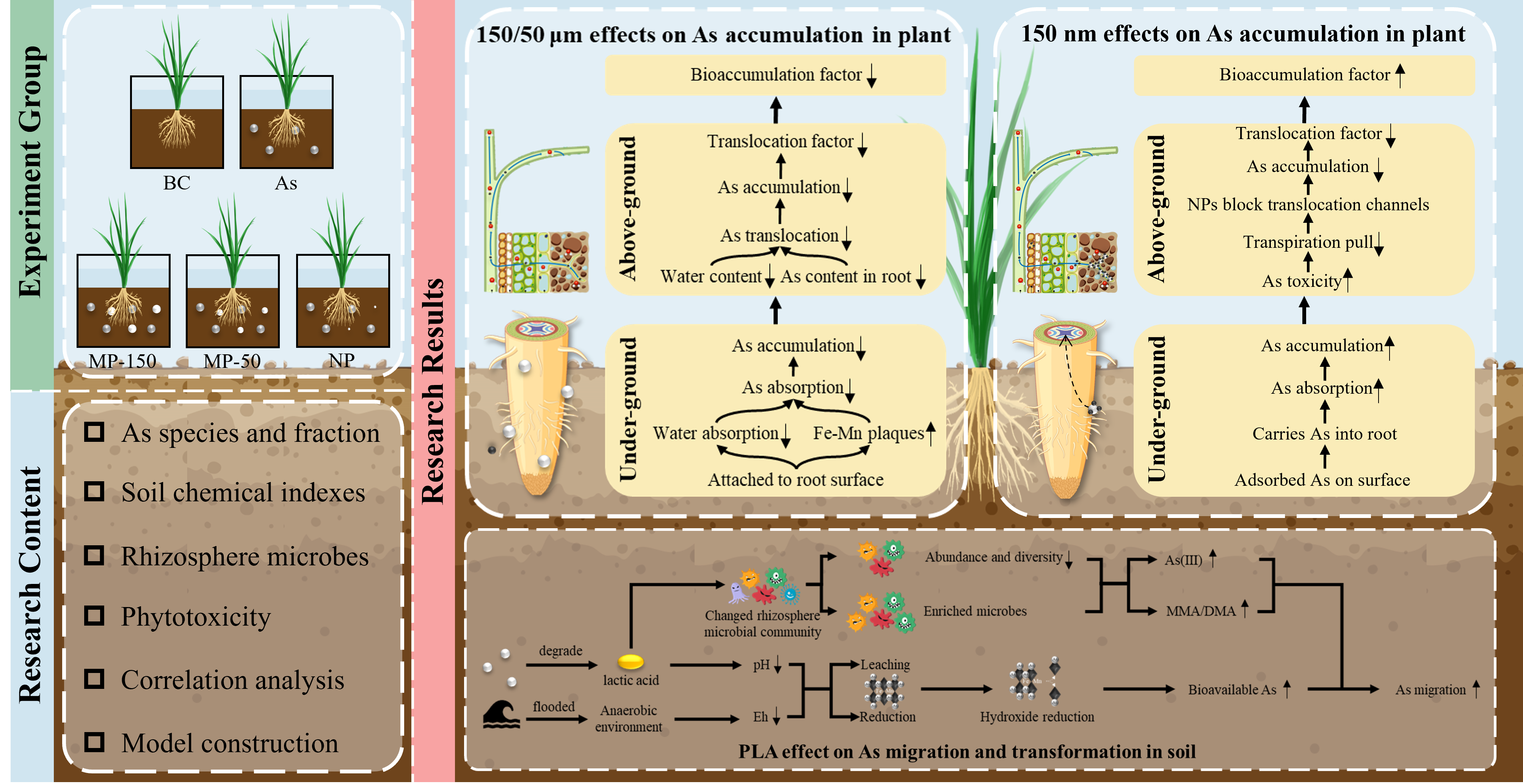 塑料制品因其成本低、重量轻、便于携带等特点,广泛应用于日常生活和工业生产中。但因传统塑料的降解性有限,这同时导致了严重的环境污染问题。随着人们环保意识的增强和政府法规的实施,为了应对塑料污染问题,更加绿色环保的可生物降解塑料制品被开发、生产和使用。其中,聚乳酸因其原材料来源于可再生植物,被广泛应用于农业生产、食品包装和医疗器械等各个行业。尽管人们普遍认为可生物降解微塑料会被环境中的微生物完全降解,但这种易感性表明它可能更容易分解成粒径小于5毫米的微塑料(Microplastics,MPs),甚至纳米塑料(Nanoplastics,NPs)。这些MPs和NPs会扰乱生物地球化学循环,阻碍植物的发育,并可通过食物链对人类健康构成威胁,具有引发各种生态和健康问题的风险。与此同时,类金属因具有致癌、致畸、致突变的高毒性,使其在农业生产中受到高度重视。然而,目前我们对可生物降解M(N)Ps与砷联合污染下对农作物的综合影响及其联合毒性机制尚不清楚。