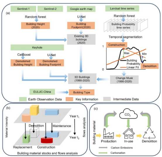 研究团队基于多源遥感数据整合了多种机器学习模型成功精准识别了城市建筑的足迹、高度、类型等属性,通过长时间序列遥感数据与时间分割算法识别了建筑的建造与拆除过程,成功恢复了厦门市过去30年的城市三维建筑动态变化过程。通过耦合物质流分析模型、生命周期评估和水泥碳化动力学模型,成功追踪了厦门市1990-2020年的城市物质代谢与隐含碳动态。