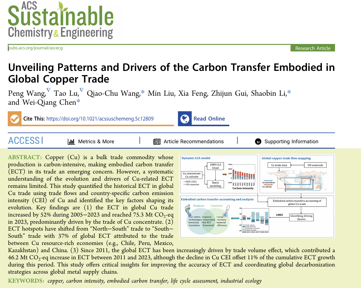 相关研究成果以“Unveiling Patterns and Drivers of the Carbon Transfer Embodied in Global Copper Trade” 为题,发表于国际知名期刊“ACS Sustainable Chemistry & Engineering”(JCR Q1分区)。该论文由厦门大学与城市所联合培养的硕士生王鹏、易碳数科陆韬博士担任共同第一作者,厦门大学李少斌副教授和城市所王翘楚副研究员、陈伟强研究员为共同通讯作者。