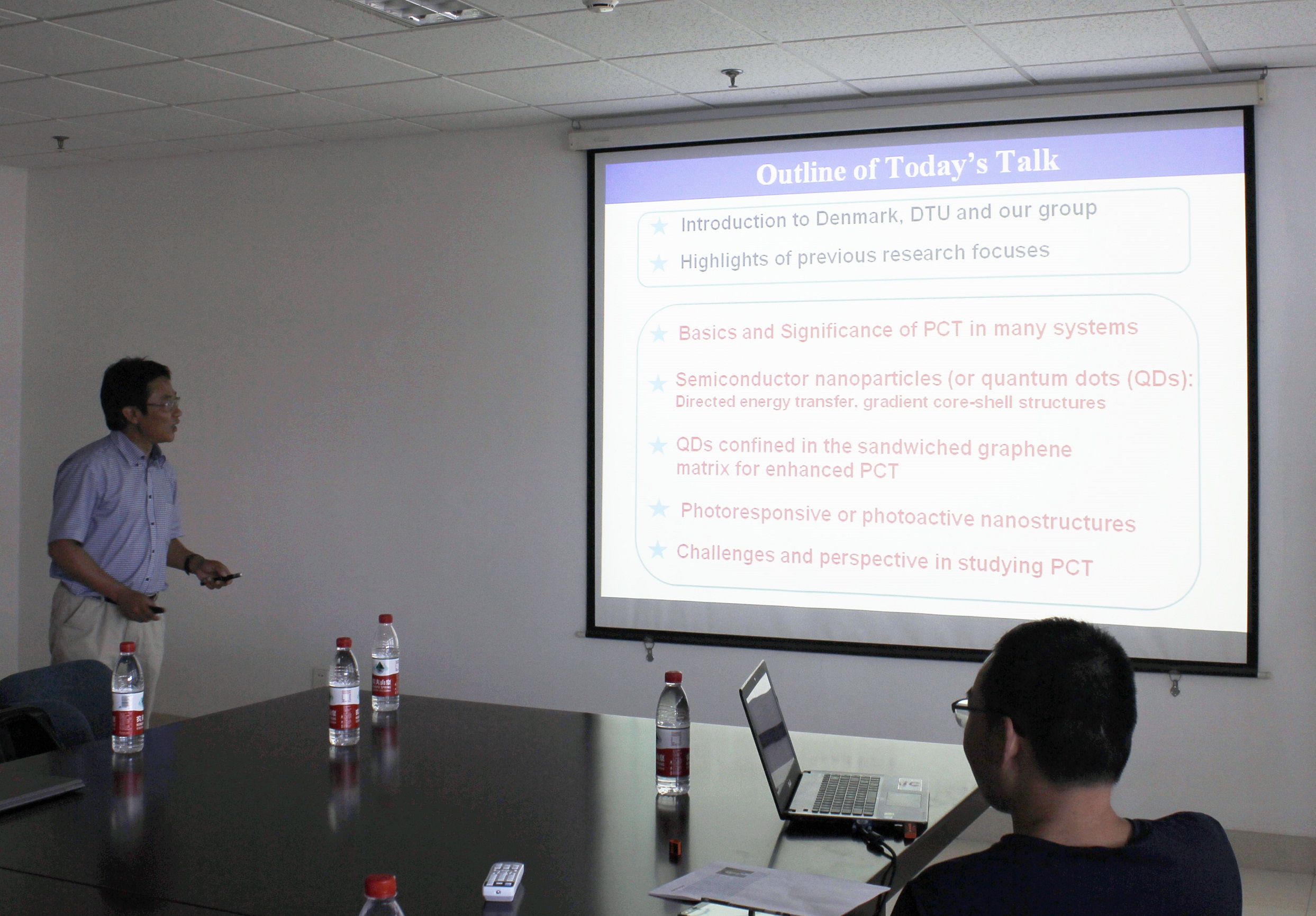 应中国科学院青年创新促进会、中科院城市污染物转化重点实验室和赵峰研究组邀请,丹麦技术大学池其金副教授于7月12-16日访问城市环境研究所。访问期间,池其金做了题为“Engineering Nanostructured Material Systems for Enhanced Photoinduced Charge Transfer”的学术报告,池教授介绍了光诱导电荷转移(Photoinduced Charge Transfer)在自然界光合作用和光电器件中的作用及其基本过程,后系统地介绍了半导体纳米颗粒(即量子点QDs)、氧化还原石墨烯(rGO)-QD复合材料和柔性超轻金属氧化物薄膜的制备及其在光电水分离、具有抗氧化特性的光敏核壳纤维和碳纳米管类囊体膜介导的生物太阳能电化学系统等方面的应用。最后,池其金对当前所面临的挑战和未来可能的研究方向进行了展望,并与现场科研人员深入交流与探讨,现场气氛热烈。