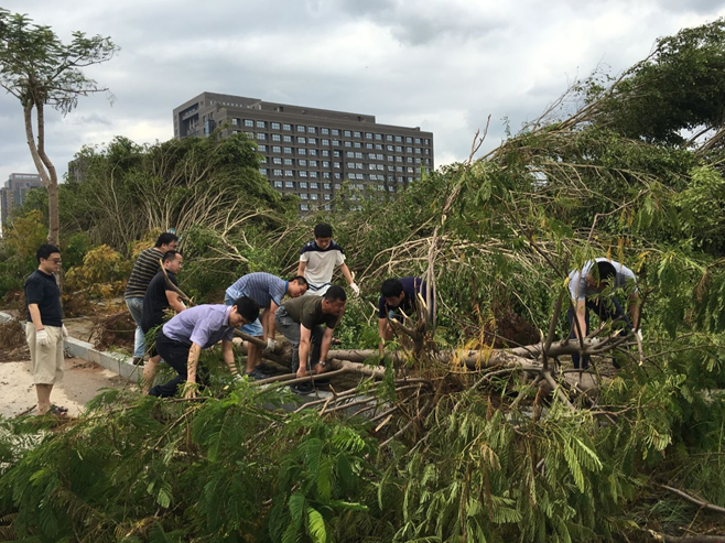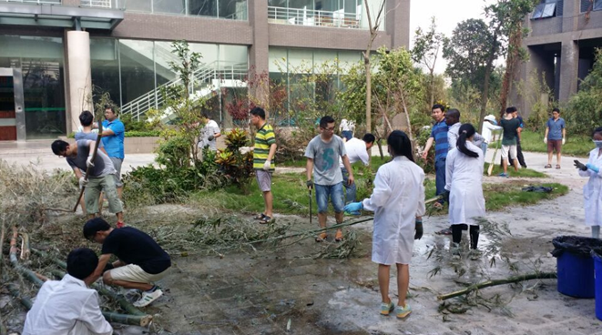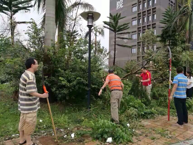 在抗击台风侵袭及灾后生产自救开展过程中,领导班子发挥坚强领导作用和率先垂范,管理部门积极协调和组织,职工与学生鼎力参与,物业工作人员辛勤付出。台风灾害造成的损失虽不可避免,但在抗击台风中,庞睿智等职工和李睿等同学在研究所遇到困难时挺身而出,自觉自愿参与灾后生产自救工作,以实际行动弘扬着“忠诚尽责”所训精神。
