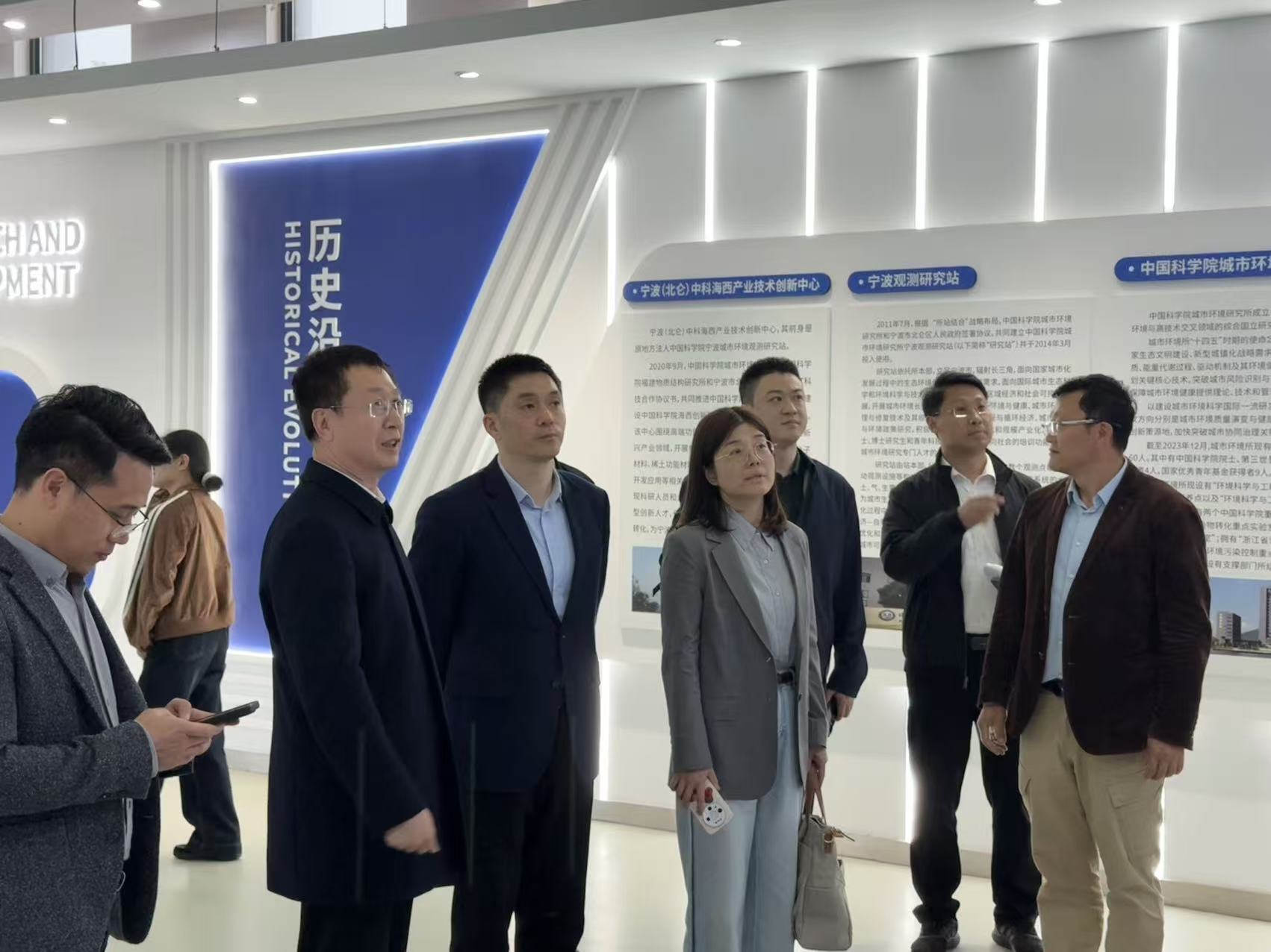 蒋跃一行首先参观了宁波站(创新中心)展厅,全面了解宁波站的建设历程、科研布局、核心技术成果。随后前往智能化环境功能材料量产示范中试平台,实地察看平台建设运营情况,详细询问中试产品的技术优势、量产能力、应用场景及市场前景。