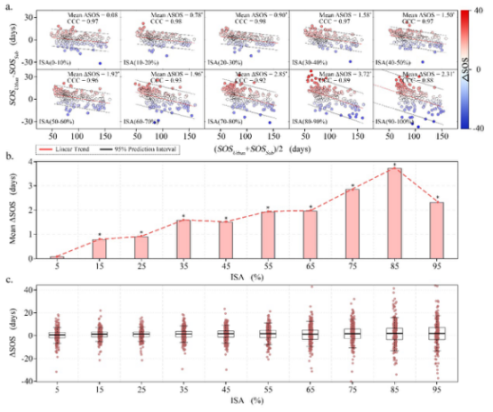 鉴于此,本研究以中国 233 个面积超 100km² 的城市为研究对象,基于 MODIS 植被物候数据(生长季始期 SOS、生长季末期 EOS、生长季长度 GSL)与 GAIA 不透水面数据,通过对比分析城市核心区与郊区在 0%–100% 城市化强度梯度下的植被物候响应特征,结合地理分区与生态区划分,系统探究植被物候对城市化强度的响应规律及空间异质性。结果表明:(1)城市核心区与郊区植被物候对城市化强度的响应存在显著差异,且均呈现非线性关联;(2)随着 ISA 升高,核心区与郊区的 SOS、EOS 差异显著扩大,城市化强度越高,核心区 SOS 与 EOS 的延迟效应较郊区更为突出;(3)该物候差异具有强烈空间异质性,中国西北地区表现尤为显著,城市化程度越高,核心区 SOS 延迟越明显,且相对于郊区的 GSL 缩短效应更为突出。研究证实,城市环境是驱动植被物候变化的核心因素而非单一 ISA,未来全球变化背景下的物候研究需充分考虑城市环境的综合影响,为城市生态规划与气候适应策略制定提供科学支撑。